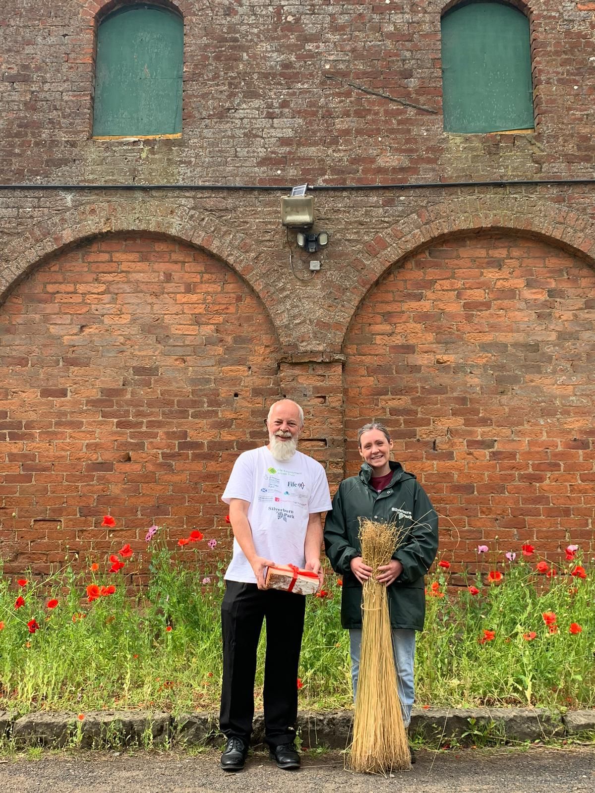 Photograph: Duncan Mitchell with Fiona Young (Activities Co-ordinator) outside the flax mill, Fiona pictured with flax sown in the Park as part of the initial heritage information programme.