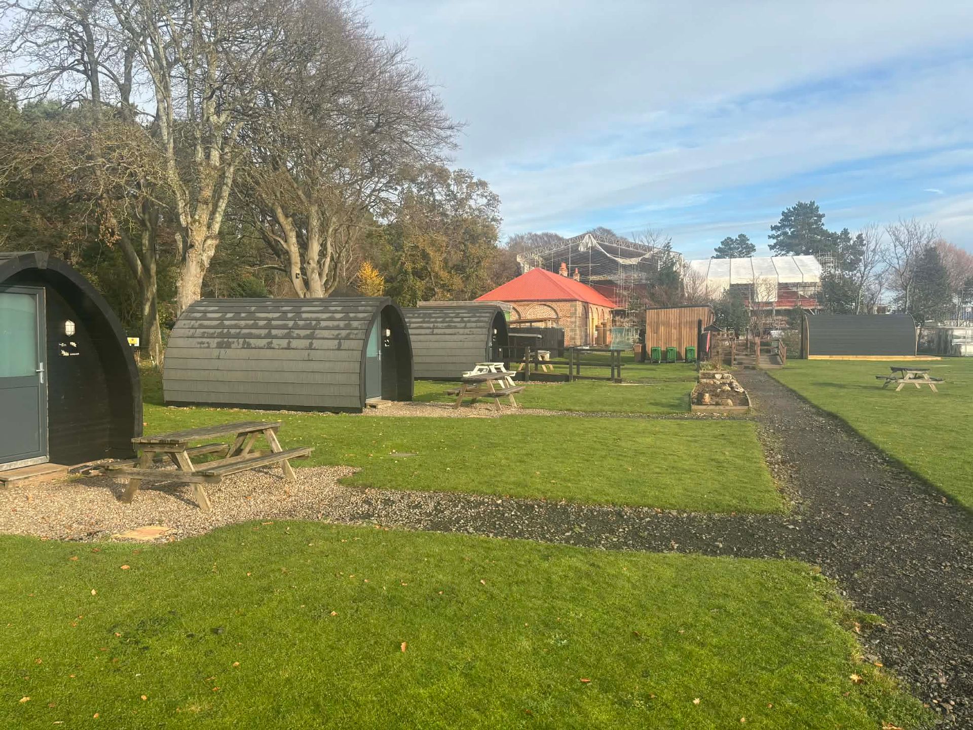 Our Eco-Pods & Tent Pitches are located on our main campsite which is situated on the opposite side of the works entrance far away from the majority of work. Noise levels from the construction here are always very low, especially on the higher numbered tent pitches which are further away from any ongoing work.