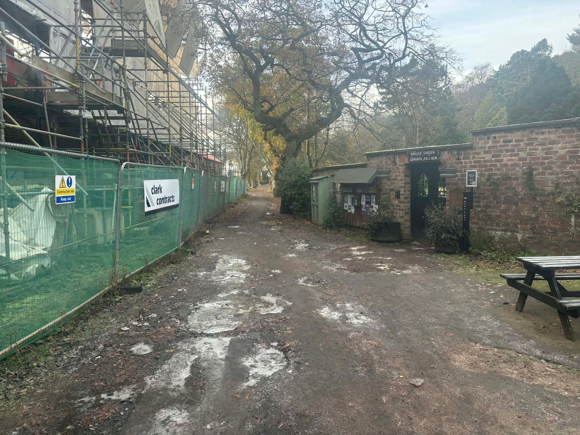 Avenue towards Campsite. Muddy conditions in wet weather but you can drive down here. On foot this can be bypassed by using the path through the walled garden.