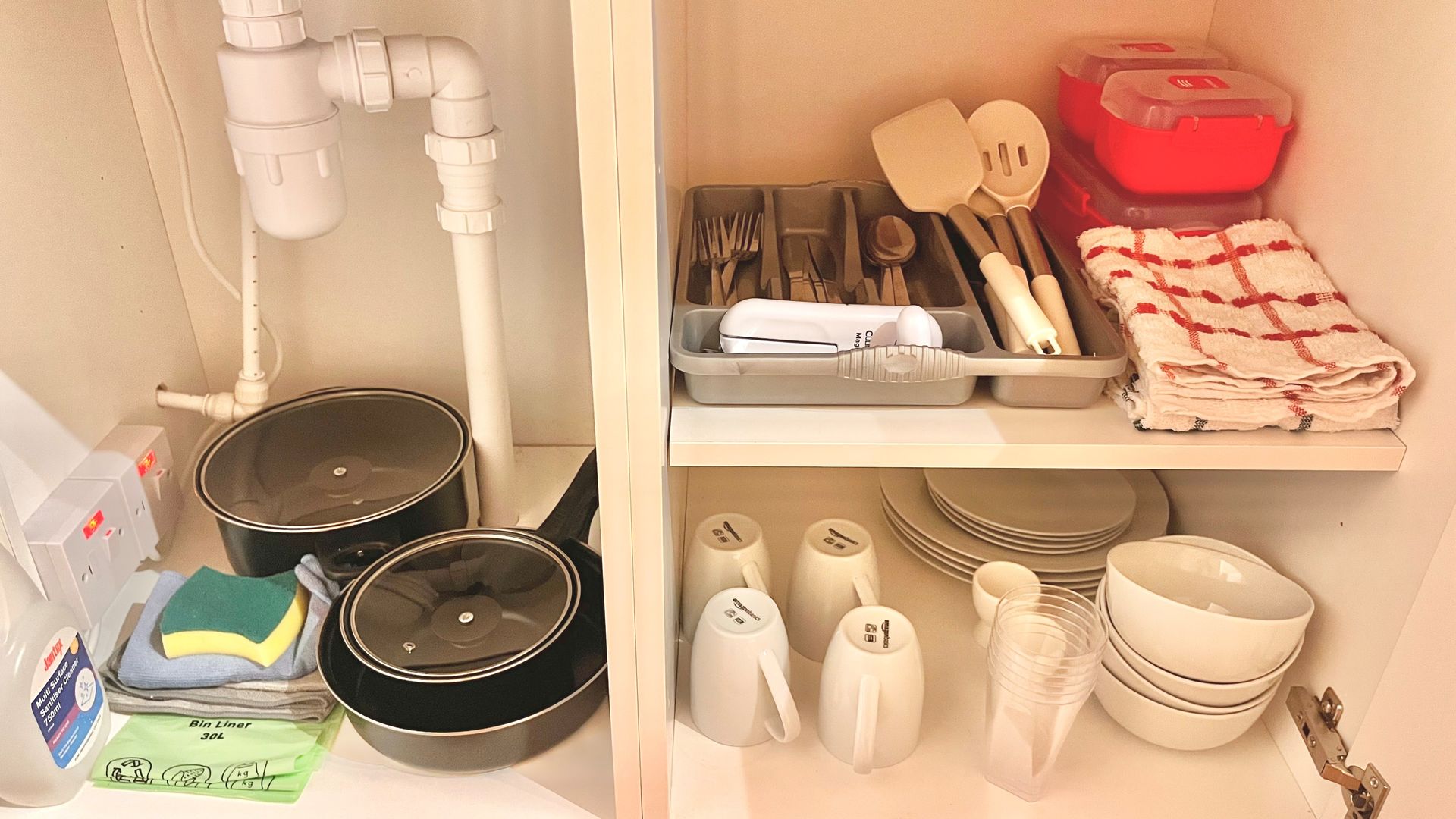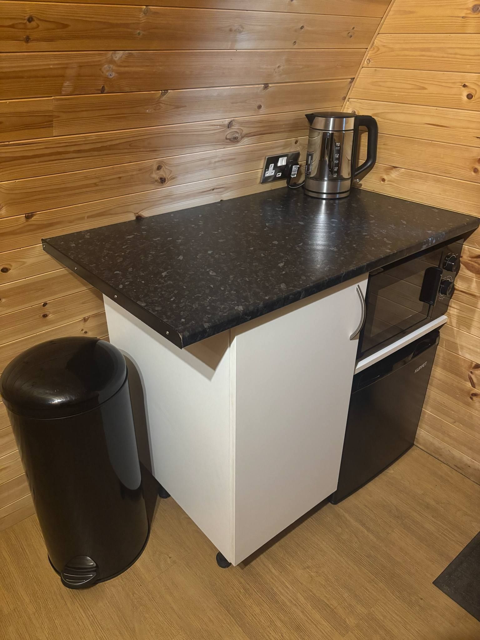 Equipped with a kettle, microwave, fride/freezer, sink & 2-ring electric hob.